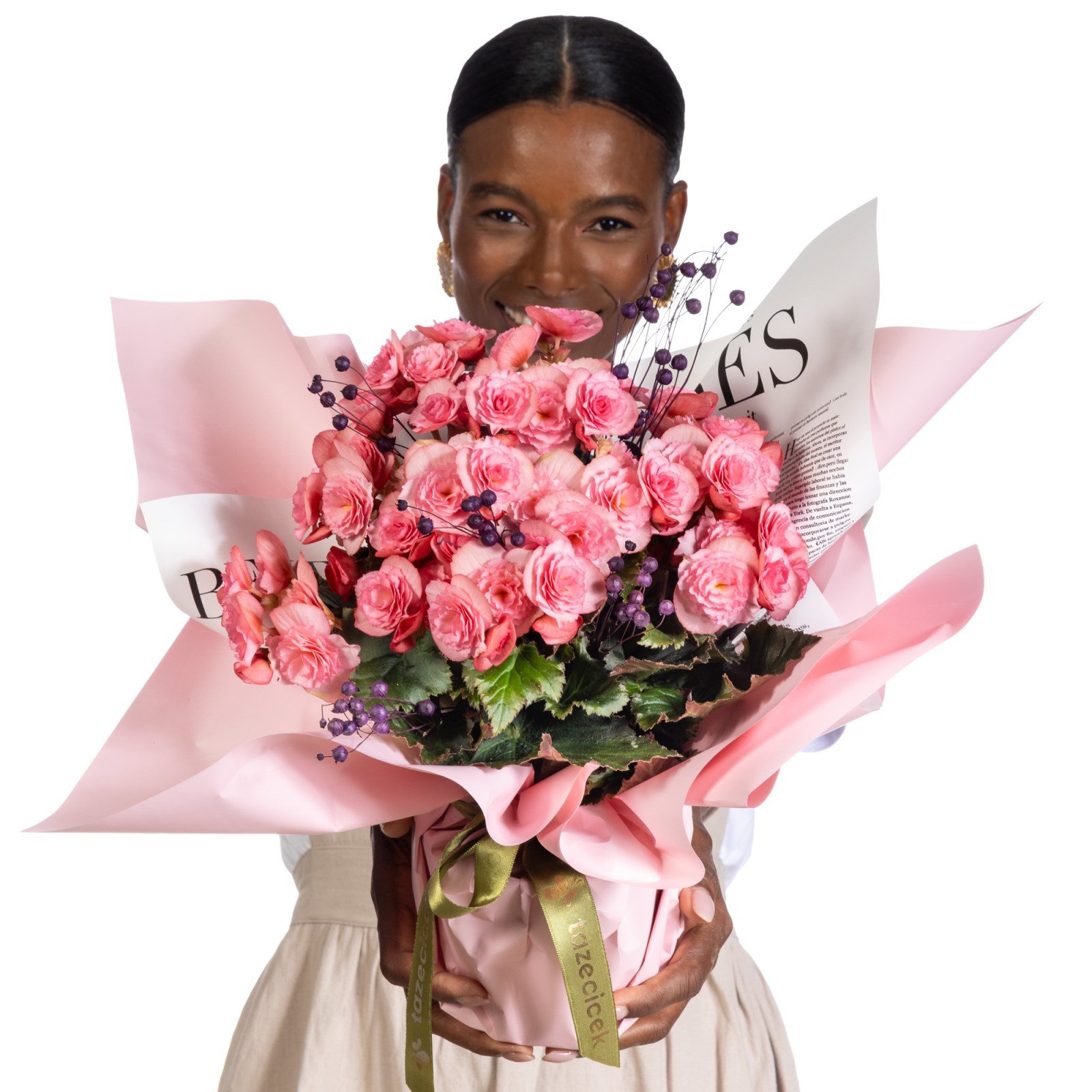 Lovely Glow Begonya, zarifliği ve şıklığı bir arada sunuyor. Canlı pembe begonya çiçekleri, modern pembe ambalaj ve doğal zeytin yeşili kurdelesi ile buluşarak estetik bir görünüm kazanıyor. Aranjmana eklenen mor dekoratif detaylar ise çiçeğin enerjisini yükseltiyor ve romantik bir hava katıyor.