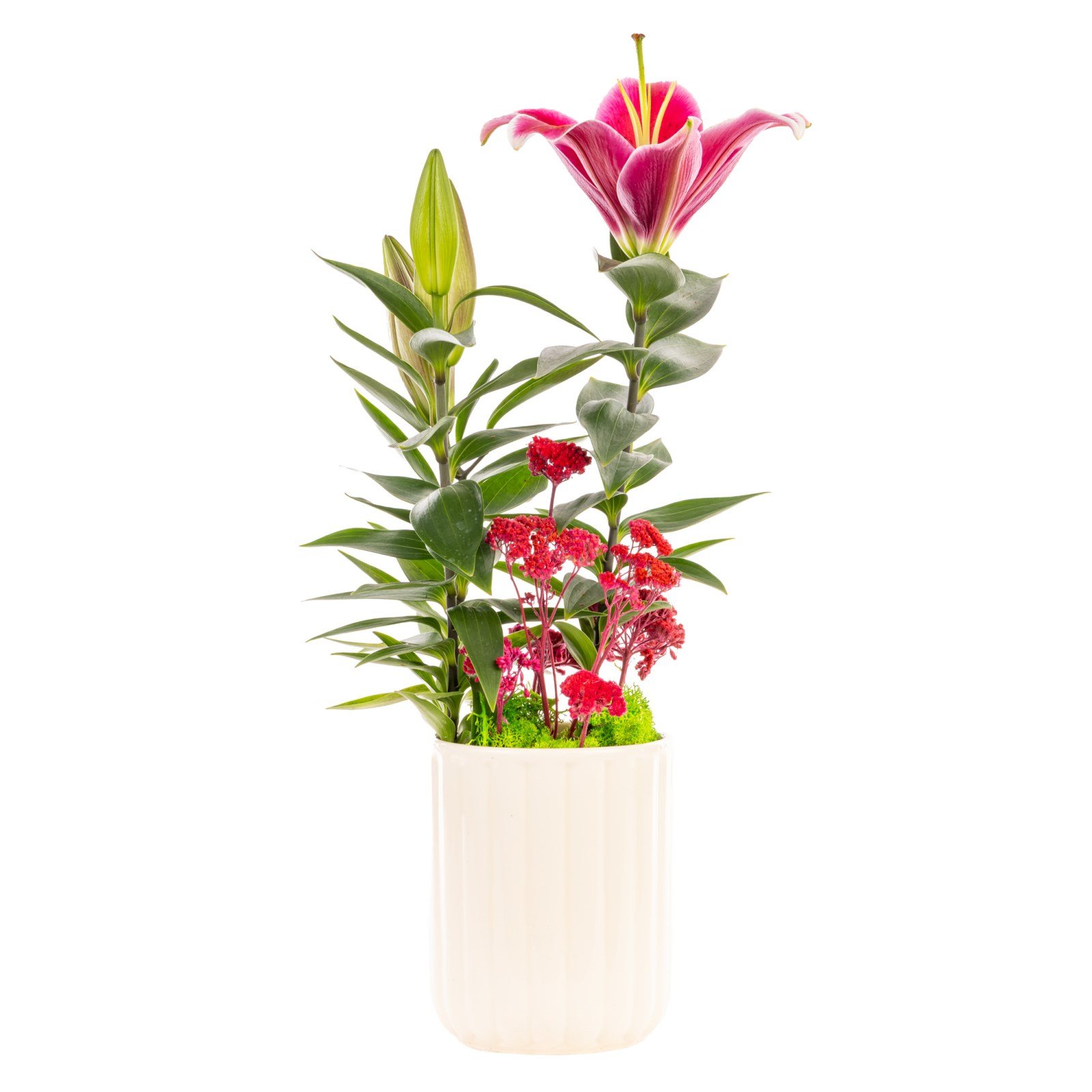 Pembe lilyumların zarif dokusu, kırmızı çiçeklerin yoğun duygusallığıyla birleşerek Romantic Touch Lilyum aranjmanını ortaya çıkarır. Beyaz seramik saksı içerisinde hazırlanan bu özel tasarım, renklerin kontrastından doğan romantik bir atmosfer yaratır. Çiçeklerin doğal güzelliği, dekoratif yeşilliklerle harmanlanarak kusursuz bir bütünlük oluşturur. Sevdiklerinize aşkınızı, sevginizi ya da teşekkürlerinizi dile getirmek için en zarif yollardan biri olan bu aranjman, bulunduğu ortama sıcaklık ve anlam katar.
